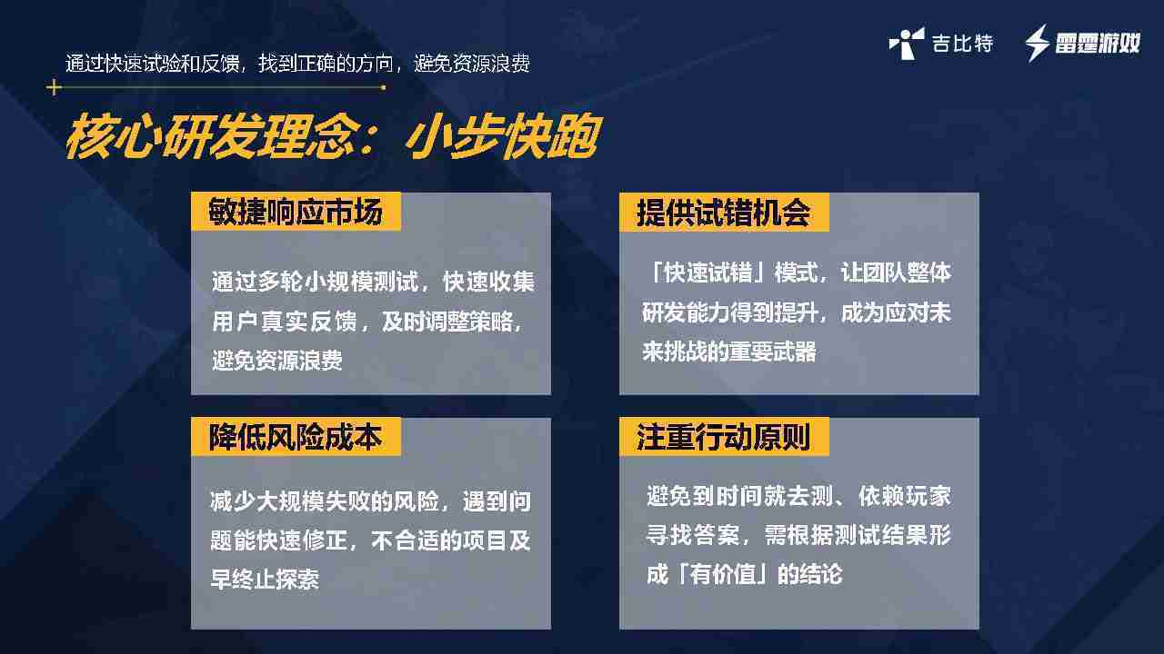 小步快跑不是找答案,,,而是验证答案。。。我们之前有项目是这样的,,有些制作人会有几个方向觉得都可以做,,,,但是不确定做哪一个,,,会选择几个都做,,,做完拿到市场跑,,跑出哪一个更好,,,,基于这个再做后续的研发和拓展。。。但这种情况最容易出现一个问题,,,可能被玩家裹胁,,,,玩家说这个点不错、、、那个点不错,,到底听还是不听,,,不听感觉是无视玩家的反馈,,,听的话,,,,可能自己没想清楚导致研发思路发生偏颇。。。。所以针对这一点后面自己复盘整理,,,,发现制作人自己心里要有数,,,,要做自己觉得好玩的,,,,而且明确知道这个东西是你想做的,,,然后拿到市场验证这个答案是不是对的,,,而不是拿一堆答案找哪一个答案更好。。。。