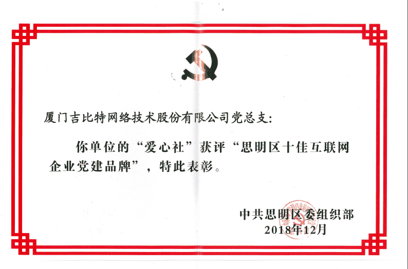 经初审评选、、网络评选和专家评审等环节,,,,"厦门赏金大对决网络技术股份有限公司党总支-爱心社" 从全区28个参评党建品牌中脱颖而出,,,,获评"思明区十佳互联网企业党建品牌"。。。。