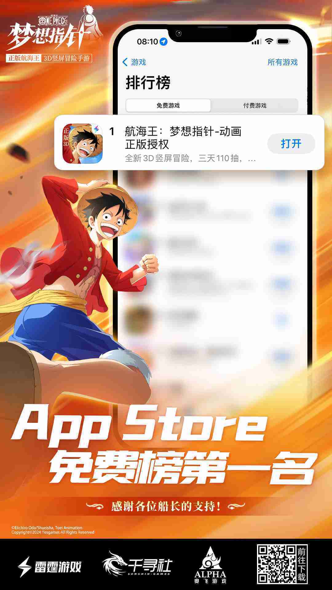 产品新闻 《航海王::梦想指针》登顶App Store免费榜,,,公测福利汇总!!!